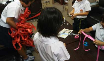 単にテープをつなぐという活動の中でも、子どもたちは、どの色のテープをどのぐらいの長さに切って、どのようにつなぐか(クロスさせる、輪にする等)を考え、試行錯誤する中で「色や形」に対する感性を育んでいきます。