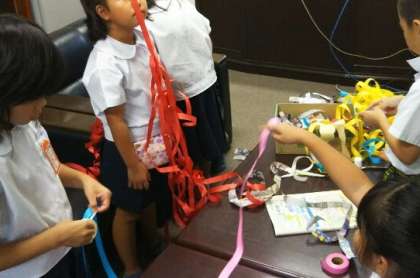 活動の途中で、自分のつないだテープを引っ張りながら歩いて、「犬のお散歩してるの。」と言ってみたり、首からかけて「首飾りにした。」と友だちに伝えたり「見立て遊び」を始める子どももいます。「図工にがてなんだけど、これ楽しい。」とつぶやきながら活動している子どももいました。
