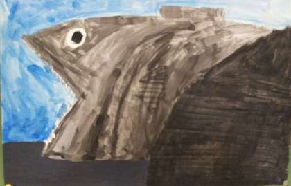 こんな大物を釣り上げたのでしょうか、または、漁港の市場で並んでいたマグロ?黒色の濃淡で、立体的に描きました。