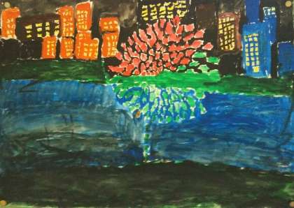 花火の明かりで浮かび上がるビル、暗い川面に映る花火、手前の暗闇に広がる草むら。描き方をとても工夫しています。