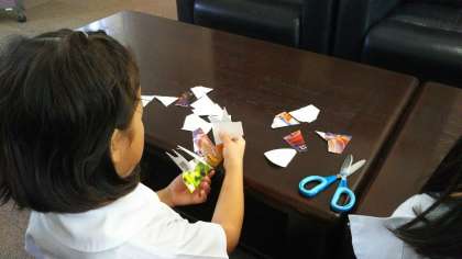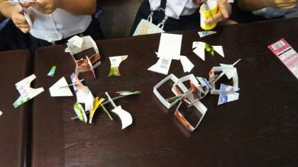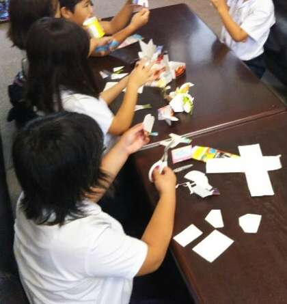 いつも、「図工を教えてください!」と校長室に来る2年生の女の子。(写真上)今は、紙パックを切って、切込みを入れ、組み合わせていく操作に夢中になっています。
