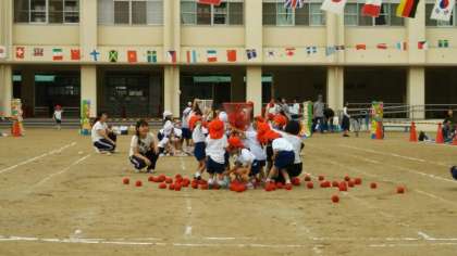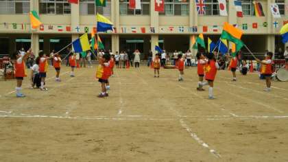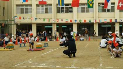 学校のおとなりの島屋保育所の運動会が、島屋小学校の運動場で行われました。