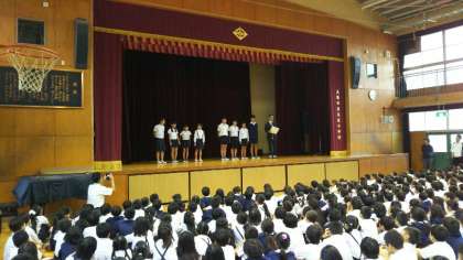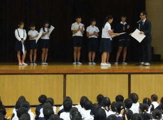 今日の児童朝会で、全校児童の前で賞状を渡しました。