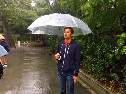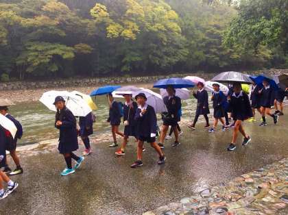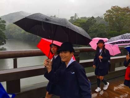 大雨の中、伊勢神宮を見学しました。境内の木々は大変大きく、子どもたちも驚いています。寒さが厳しい中、五十鈴川の流れも荒れ気味です。