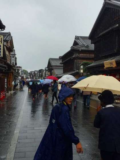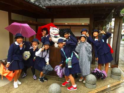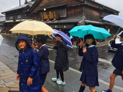 「おかげ横丁」の見学の様子です。雨は降り続き、寒さが身にしみますが、子どもたちは元気です。