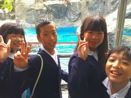 鳥羽水族館に着きました。雨の中、クラス写真を撮りました。この後は、いよいよ班行動で、順路のない水族館の中を自由に見学していきます。