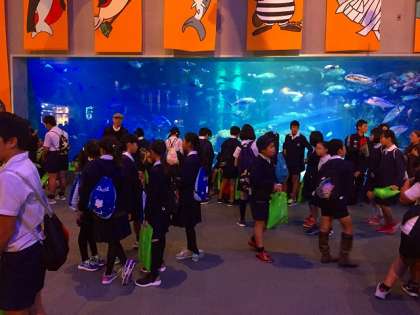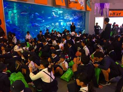 水族館のエントランスホールで人数確認。午後4時過ぎに鳥羽水族館を出発し、宿舎に向かいます。