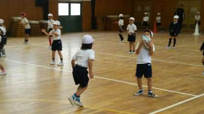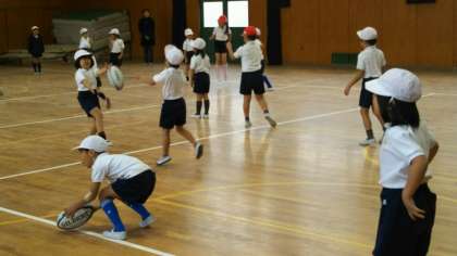 1年生が、ラグビーボールを使ったパスゲームをしました。