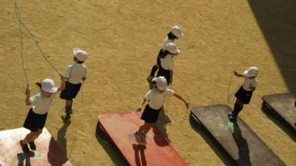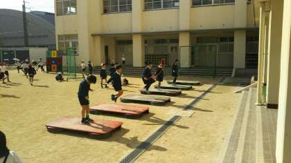 休み時間に、ジャンピングボードで、いろいろな跳び方を練習する子どもたちの姿が見られます。