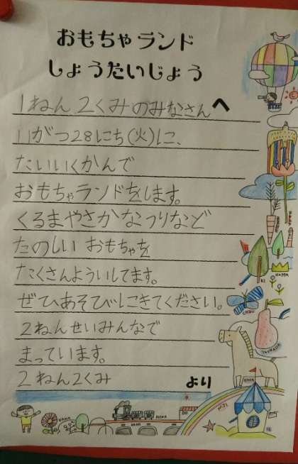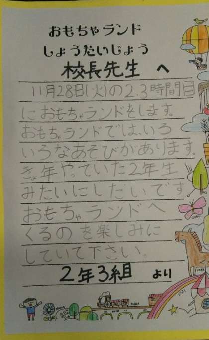 2年生から、生活科の学習「おもちゃランド」の招待状が届きました。