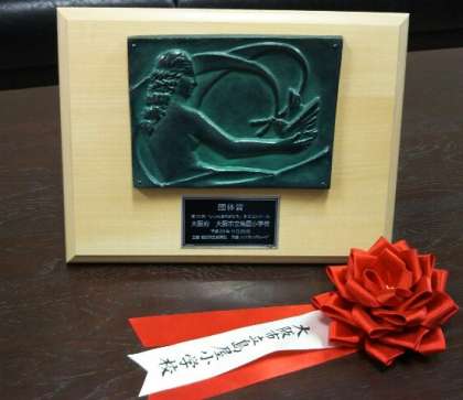 そして、今年度も団体賞をいただき、4年連続の受賞となりました。先日東京で行われた授賞式で、立派な盾と表彰状をいただきましたので、児童朝会で6年生の代表児童に渡し、みんなでお祝いしました。