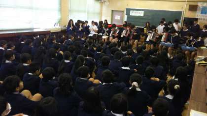6年生が、音楽の時間にクラスごとに練習していた合奏曲の発表会をしました。