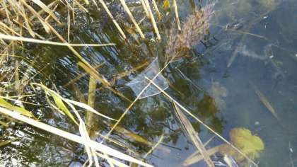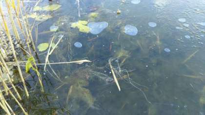 今朝はとても冷え込み、学習園の池に、厚い氷がはりました。