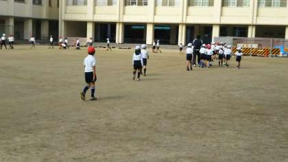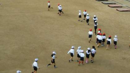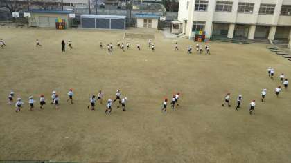 冷え込んだピーンとした空気の中で、1年生の子どもたちが、元気にかけ足をしています。(写真上・中)自分のペースで、無理なく走り、走り終わった後は、ゆっくり歩きながら、呼吸を整えます。(写真下)