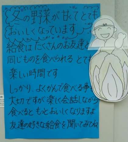 今は、「冬の野菜が甘くてとても美味しくなっています」というメッセージが貼られています。「友だちと給食を楽しみましょう」という内容も書かれています。