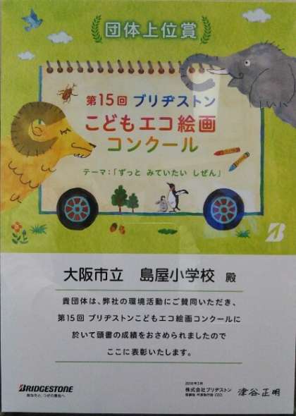 第15回ブリジストンこどもエコ絵画コンクールで、「団体上位賞」を受賞しました。テーマは、「ずっと みていたい しぜん」でした。応募した児童には、作品をプリントしたエコバックをいただきました。