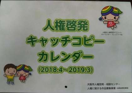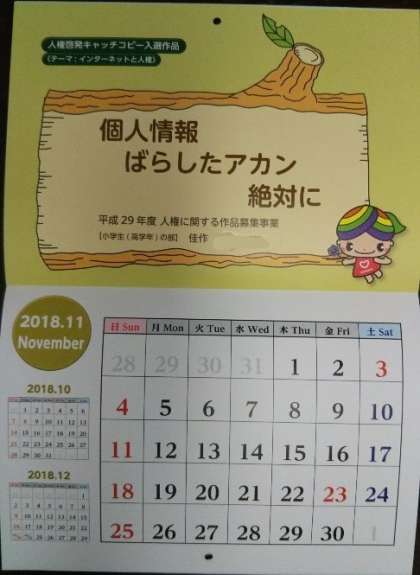 2017年度3月12日の記事で、本校児童が「人権啓発キャッチコピー」作品に応募し、表彰されたことをお伝えしましたが、その中の作品が、カレンダーにも選ばれました。