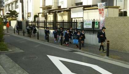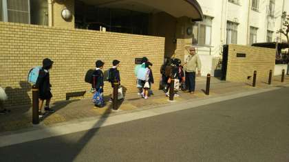 1年生の多い班は、班長さんも大変ですが、仲良く手をつないで元気に登校しています。