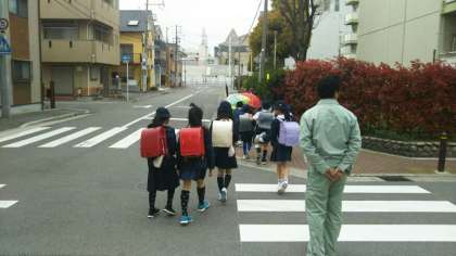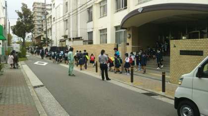 ※写真は、地区ごとに一斉集団下校をする様子。