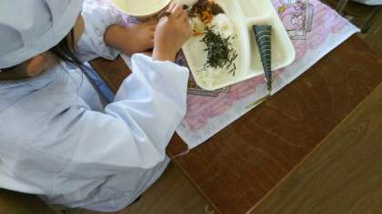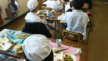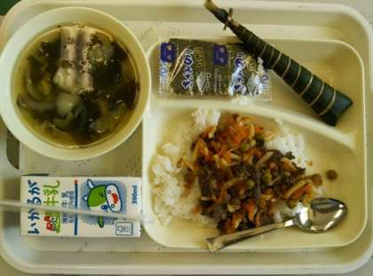 メニューは、「牛肉のちらしずし・すまし汁・ちまき・ごはん・牛乳」でした。ちらしずしには、刻みのりをふりかけて食べました。