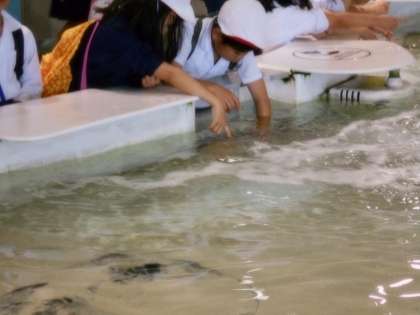 海遊館の大水槽では、ジンベイザメがゆうゆうと泳いでいました。また、アザラシやイルカを見て「かわいい!」と喜んで観察していました。サメやエイをさわることもでき、大喜びでした。