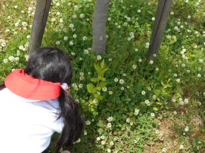 昼食後は,大阪城公園の中を探検しました。広場では,四葉のクローバー探しにみんな夢中でした。四葉のクローバーだけでなく,テントウムシやミツバチなどの昆虫を見つけたりと,いろいろな生き物や植物に親しむことができたと思います。