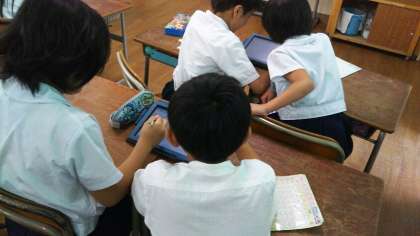 4年生の教室をのぞくと、2人1組でタブレットパソコンを使って学習を進めていました。