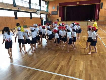 リズムダンスでは、体育館を広く使って、友達と2〜3組になって体を動かしました。友達と協力しながら楽しく活動ができました。
