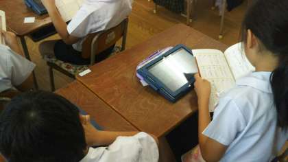 タブレットPCを操作するだけでなく、教科書巻末の漢字表も使い、熱心に漢字の学習をしていました。