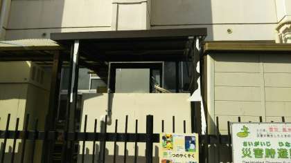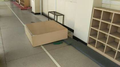 【写真下】給食室屋外冷蔵庫保護のための背板や屋根が吹き飛ばされました。