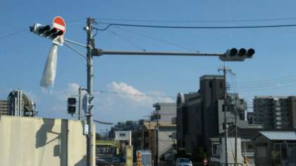 突風で、信号機が壊れて外れたり、向きが変わったりしています。また、停電により作動していない信号機もあります。