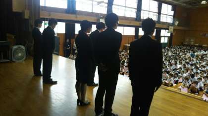 今日の児童集会であいさつをしてもらいました。子どもたちは、たくさんの若い先生の卵を前にして、少しワクワクしている様子が伺えました。(写真上)