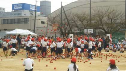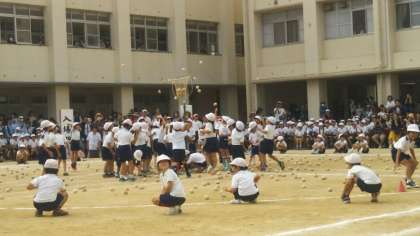 玉入れをしている途中に、音楽が鳴り出すと待機場所に戻り、音楽が止まるとまた玉を投げ始めるというルールです。