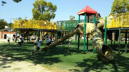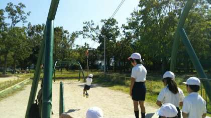 先日の台風の影響で、雑木林は立ち入り禁止になっていて、残念ながらドングリ拾いはできませんでしたが、 楽しい遊具がたくさんあり、子どもたちは歓声をあげて遊んでいました。