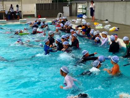 7月7日(月)、6年生ではプール換水の日に合わせて「着衣水泳」を実施しました。服を着たままプールに入ることに、子どもたちは不安な表情を見せていました。入ってみると「体が重い」「泳ぎにくい」「べたべたくっついて気持ち悪い」など、普段の水着と違うことを体感していました。