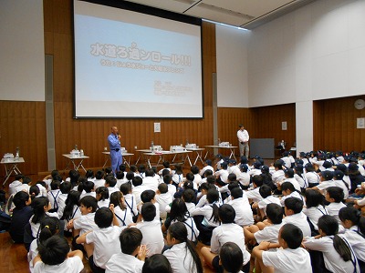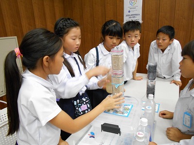 最初は映像を見ながら浄水場の仕組みを学習しました。次はクラスごとに分かれ、浄水場内を見学しました。実際に使われている排水管の模型を触りました。大きいものでだいたい直径2メートルあり、その大きさに子どもたちは驚きの声をあげていました。また、砂や活性炭を使い、水のろ過の実験もしました。濁った水がきれいな水になっていく様子を見て「すごい!」「魔法みたい!」などの声が聞こえ、興味を持ち楽しく学ぶことができました。
