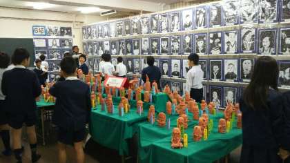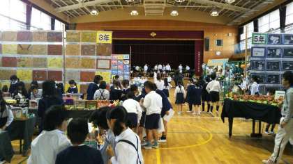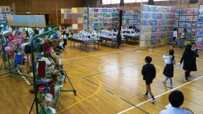 体育館(1〜5年)と多目的室(6年)で作品展を開催しています。