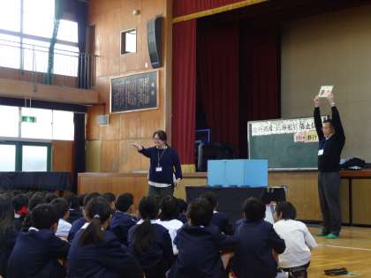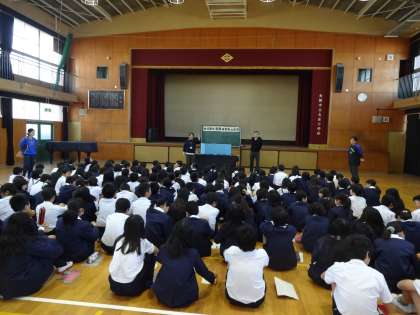 大阪府少年サポートセンターの方に、少年非行についてお話をしていただきました。非行には「万引き」「たばこ」「暴力」などがあります。その中の万引きについて、ペープサートを用いてわかりやすく説明していただきました。物の値段に関係なく、人の店の物をとることは「犯罪」であるということ「たくさんの人に迷惑をかけること」を改めて考えることができました。