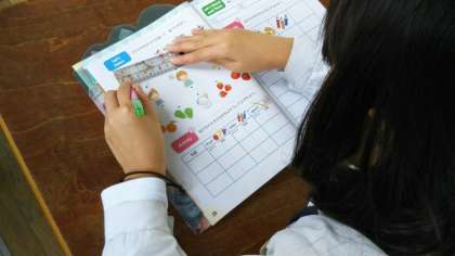 3年生が、外国語活動で、好きなくだものや色、スポーツをたずねる言い方を学習しました。