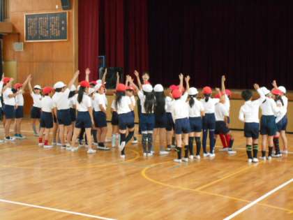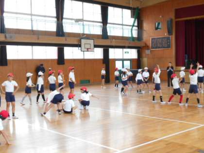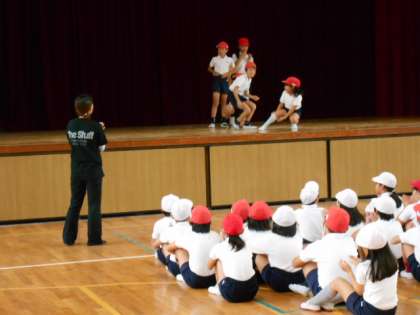 子どもたちは、なおちゃん先生にアドバイスを受けて、グループで話し合い、曲に合うように、創作ダンスをつくりました。最後には、舞台に上がって、グループごとに創作したダンスを披露しました。子どもたちは、終始、笑顔いっぱいだったのが印象的でした。