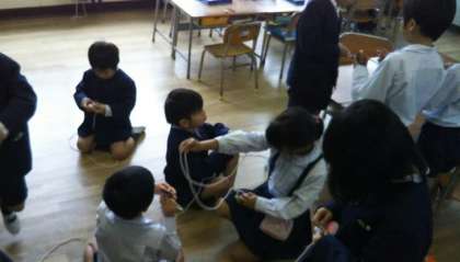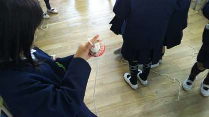 1年生が、生活の学習で、昔から伝わる遊びのコマ回しをしていました。