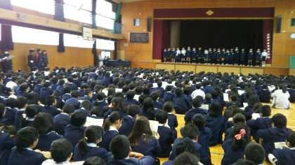 今日の集会では、代表委員会で話し合って決めた、6年生に贈る歌を練習しました。代表委員会の子どもたちが、まずお手本で歌い、歌う時のポイントを教えてくれました。