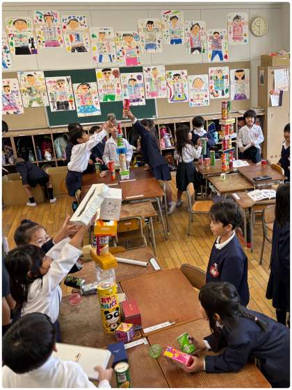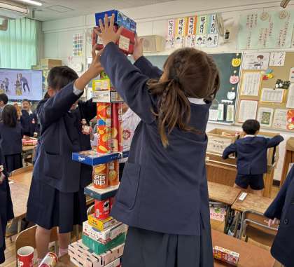 算数科「かたちあそび」の学習の様子です。「身の回りの箱を使って、いろいろな形をつくってみよう!」を目標にして班で活動しました。箱の形の特徴を考えながら「ここにこの箱を積んでみない?」「こっちの箱の方がいい大きさかな?」など、班の仲間と協力しながら活動することができました。高いタワーのような形、大きなお城のような形など、どんどんイメージがふくらんで、あっという間の1時間でした。
