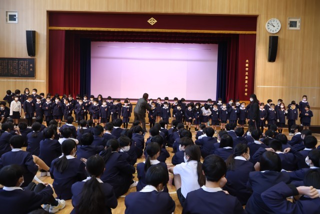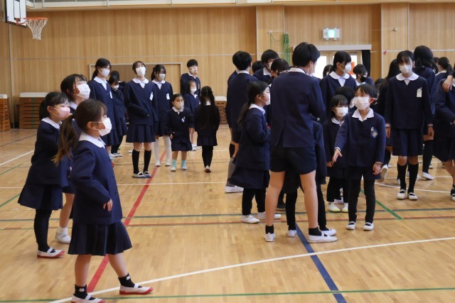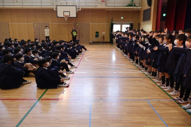 今日は1年生が6年生を招待して「ありがとう集会」が行われました。一生懸命呼びかけを行う1年生、一つ一つの言葉に6年生はとても幸せそうに頬を緩めながら笑顔になっていました。手話を交えた歌も披露してくれ、その後に「じゃんけん列車」や「猛獣狩り」のゲームをして一緒に楽しみました。温かい1年生のおもてなしに6年生も何かお返ししたいと、ボディパーカッションによる「きらきら星」と「ふるさと」の2部合唱を披露し、1年生にも喜んでもらっていました。