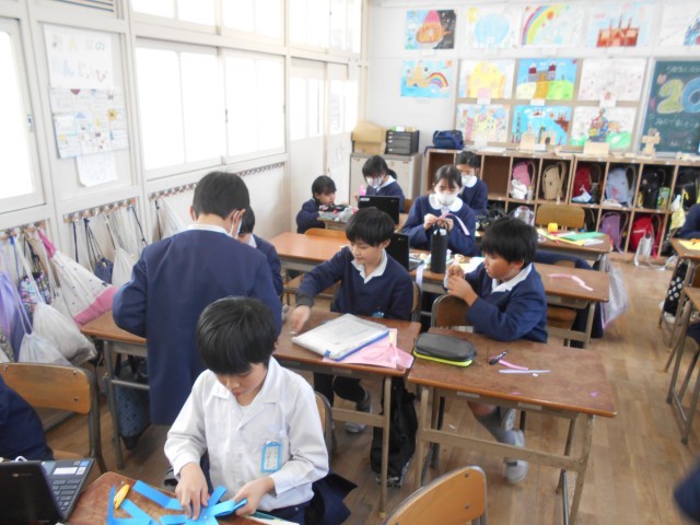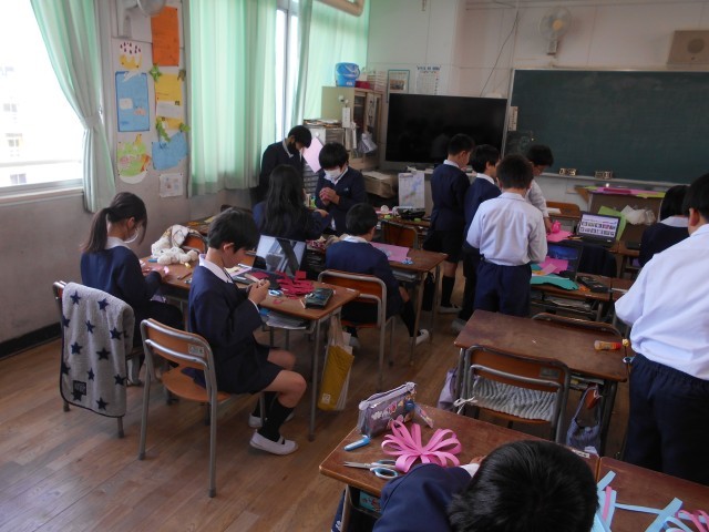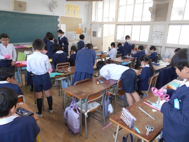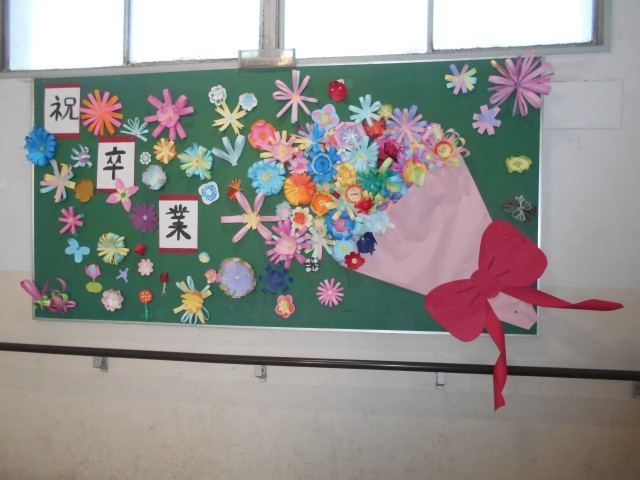 6年生の卒業をお祝いするために、4年生みんなで階段の掲示を作りました。それぞれ作った花を合わせて4年生から花束のプレゼントです。