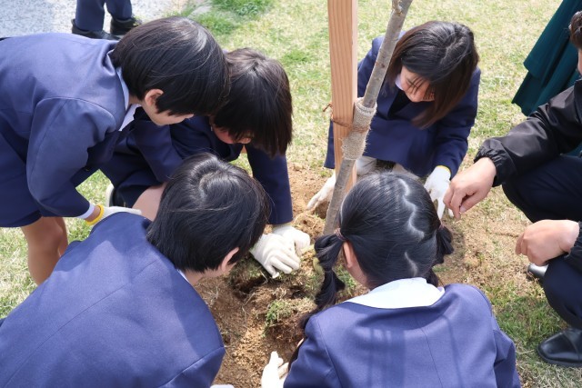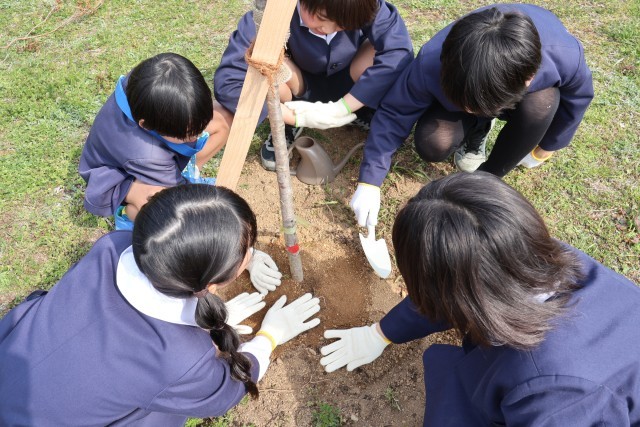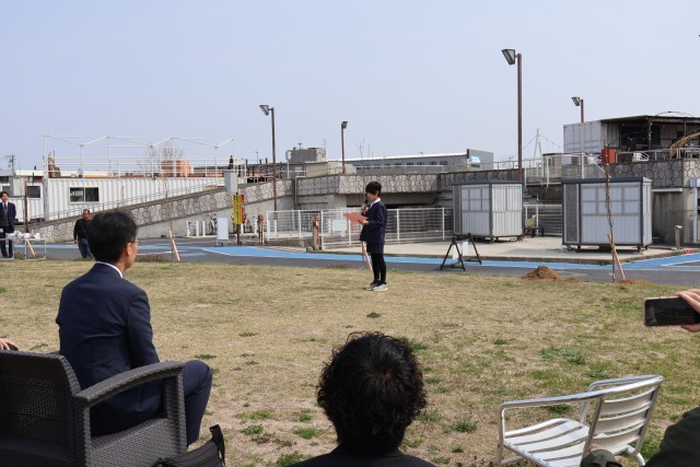 さくらの植樹式では、島屋小学校の児童が代表の挨拶と植樹体験のセレモニーを行いました。