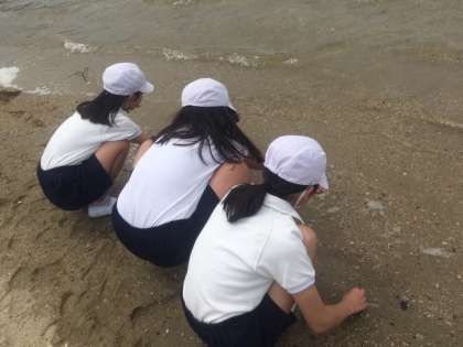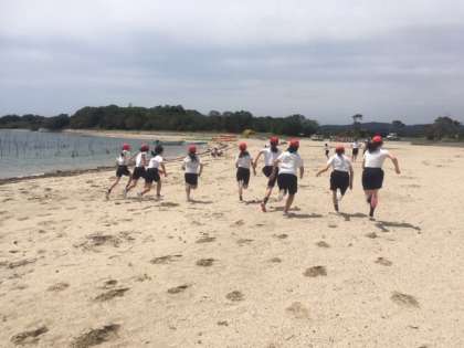 磯遊びでは、走りにくい砂浜を全力で駆け抜けたり、スイカ?割りをしたり…