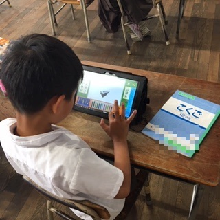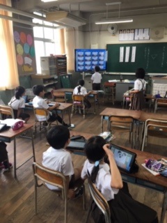 今日、2年生の国語科「ことばで絵をつたえよう」の学習で、タブレットを活用し学習しました。
