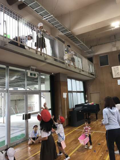 ひらひらキャッチ(左)高い所から落とされた紙切れをキャッチします。時間内に少しでも多く取れるように協力しています。