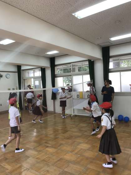 風船バレー(右)チームプレーで大人も子どもも大盛り上がりでした。